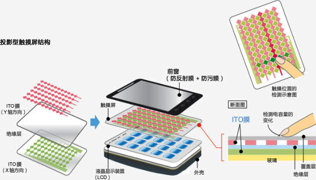 有IPHONE引領(lǐng)的投射電容觸摸屏采用多層ITO層,形成矩陣式分布,以X軸、Y軸交叉分布做為電容矩陣,當手指觸碰屏幕時,可通過X、Y軸的掃描,檢測到觸碰位置電容的變化,進而計算出手指之所在。基于此種架構(gòu),投射電容可以做到多點觸控操作。