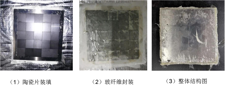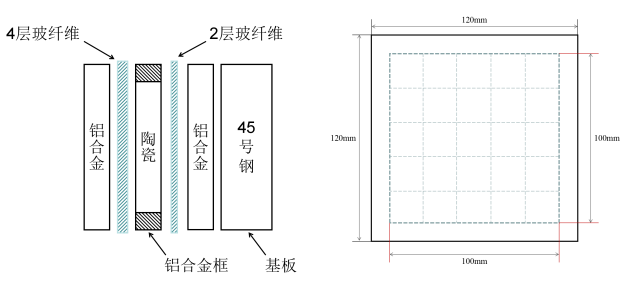 靶板從左到右依次為鋁合金面板、4層玻纖布、鋁合金邊框及陶瓷片、2層玻纖布、鋁合金背板、45號鋼基板。采用鋁合金邊框?qū)μ沾蓧K進(jìn)行二維約束,再將玻纖布平鋪在陶瓷層的正面和背面(正面鋪上四層玻纖布、背面鋪上兩層玻纖布),正面與背面再用鋁合金板密封,使用聚氨酯膠黏劑將整個(gè)結(jié)構(gòu)在常溫下固化成型為復(fù)合裝甲陶瓷結(jié)構(gòu)件。