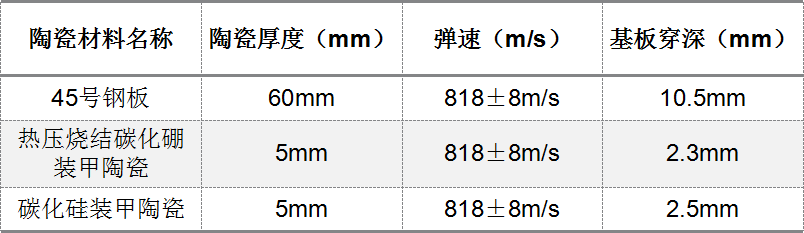 測試中,采用空白靶最對比,85式7.62毫米狙擊步槍對45號鋼的垂直侵徹深度為10.5mm,以此作為陶瓷復(fù)合裝甲的抗彈性能評判標(biāo)準(zhǔn)。對熱壓碳化硼裝甲片、碳化硅裝甲片進(jìn)行抗彈性能進(jìn)行評估。