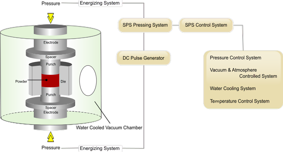 該技術是在加壓粉體粒子間直接通入脈沖電流,由火花放電瞬間產生的等離子體進行加熱,利用場效應、熱效應等在低溫下進行短時間燒結的新技術。SPS采用的是直流脈沖電流通電加壓燒結的方法,通過控制電流大小、脈沖的占空比、氣氛、壓頭的壓力、行程等參數(shù)來對工藝進行控制。