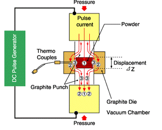 SPS工藝是一種電燒結技術,它將來自于脈沖發(fā)生器的脈沖電流施加到顆粒粉末上(見下圖),除了促進上述燒結的因素外,發(fā)生在粉末顆粒之間的有效放電,也促進了燒結。