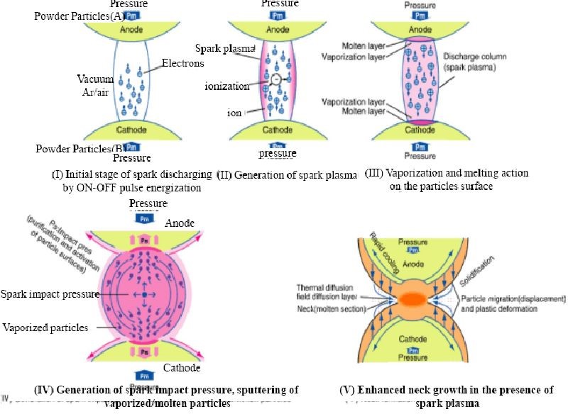 最初由Inoue和SPS工藝等人研究認為,脈沖電流在顆粒觸點之間產(chǎn)生高溫火花甚至等離子體,這也是該工藝被命名的原因。而Inoue等在之后的研究中認為由于火花放電引起的粒子接觸電離產(chǎn)生了“脈沖壓力”,促進了原子在接觸處的擴散。Groza等研究提出脈沖電流在顆粒表面上具有清潔效果,而顆粒之間沒有形成氧化。
