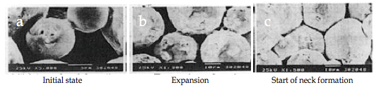 圖a顯示了由于等離子體中的火花引起的頸部形成的初始階段的行為。熱量立即從火花放電柱的中心傳遞到球體表面并擴散,使得晶間結合部分快速冷卻。如圖b所示,其顯示了幾個頸部,脈沖在顆粒之間一個接一個地引起火花放電。即使單個顆粒,隨著重復放電,在相鄰顆粒之間形成頸部的位置的數(shù)量也增加。圖c顯示了SPS燒結晶界的狀態(tài),該燒結晶界在燒結進一步發(fā)展后發(fā)生塑性變形。